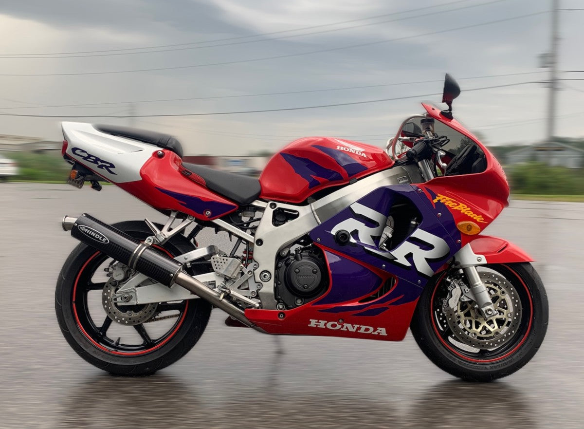 This is our new RRR/Hindle Stainless Steel Exhaust for the 1992-99 Honda CBR900RR. All our Vintage Systems are now purge welded for additional flow. This race designed system is made entirely from Stainless Steel. It is fully spring mounted in sections for quick installation and removal. The system offers full access to the oil filter and oil drain. Hindle’s unique 4-2-1 design allows for maximum horsepower and maximum torque. The Stainless Steel design makes for a super light, strong and extremely durable exhaust system which will not rust. The 1992-99 Honda CBR900RR is a no compromise system that delivers the best performance, looks and sound whether for race or street use. This exhaust is available as a full system with a choice of 14”, 16” or 18” Round Supersport Stainless Steel Mufflers (16″ and 18″ lengths slight extra charge).