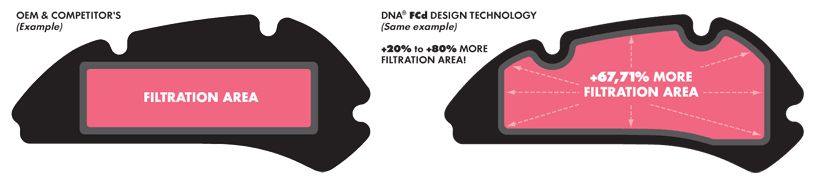 The DNA FCd design or "Welcome to the Future"! At least 20% and up to 80% more filtration area, using DNA FCd technology is common. The unique revolutionary design, an innovation by DNA, allows the pleated filtering media to follow precisely the air box contour, regardless the complexity of the shape, seriously increasing air flow. Taking advantage of the complete footprint of the air box, we eliminate "dead spots" that rob power. If the area is there why not use it!