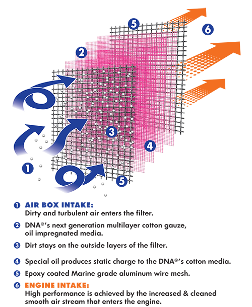 This is what Power is made of! A DNA High Performance Filter is a high quality, next generation multilayer cotton gauze, flameproof, oil impregnated air filter.