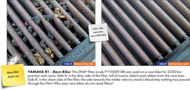 DNA replacement air filters are designed to increase horsepower and acceleration while providing excellent filtration. These filters are washable and reusable and are custom designed to fit into your existing factory air box. Their drop-in design means adding performance is simple. They offer bigger air-flow, with almost 99% filtering efficiency. It's ideal for Yamaha R6.